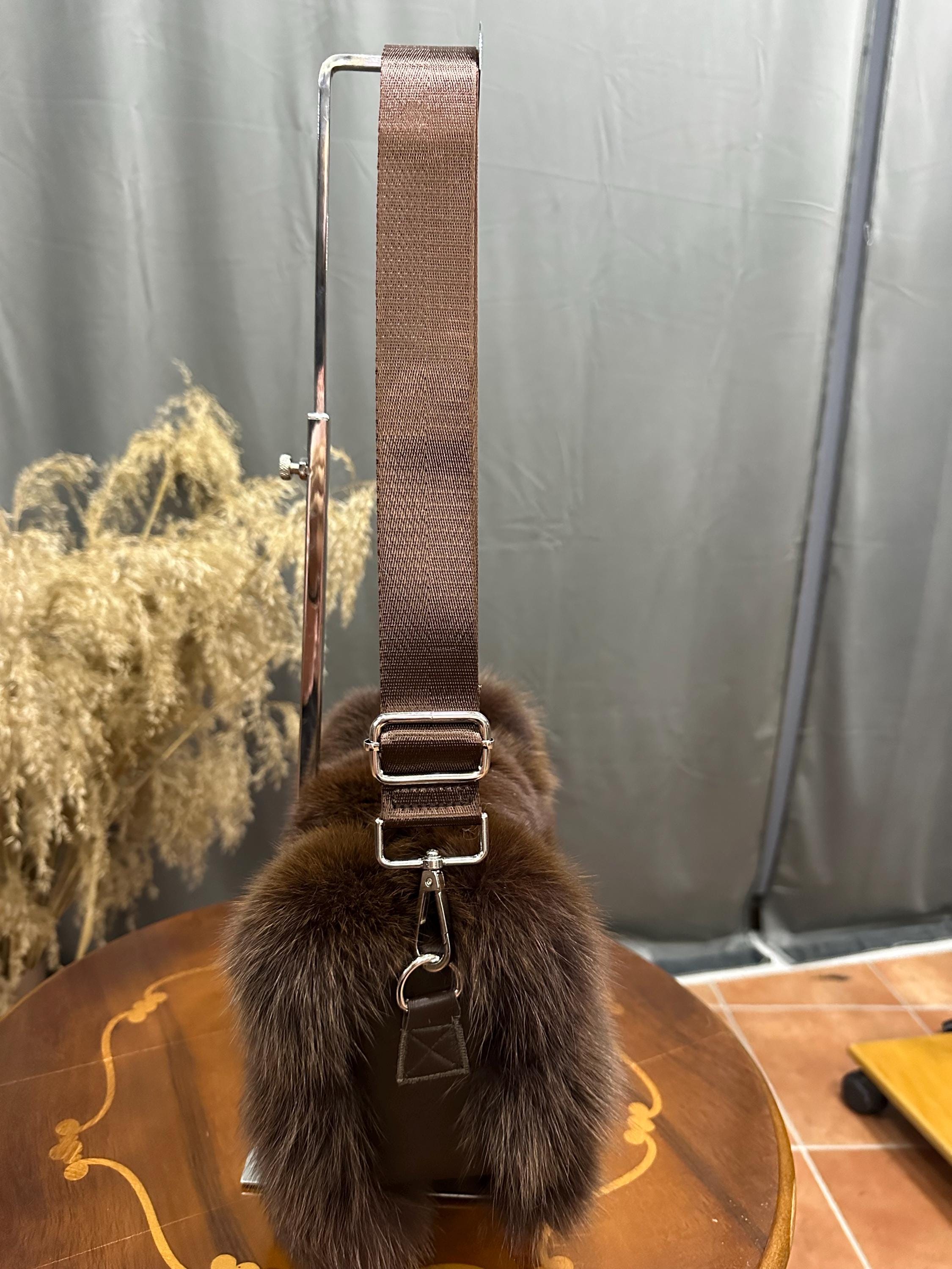 Chocolate Brown/Milk Chocolate /Ocher Fox Fur Crossbody Bag, Adjustable Leather Strap